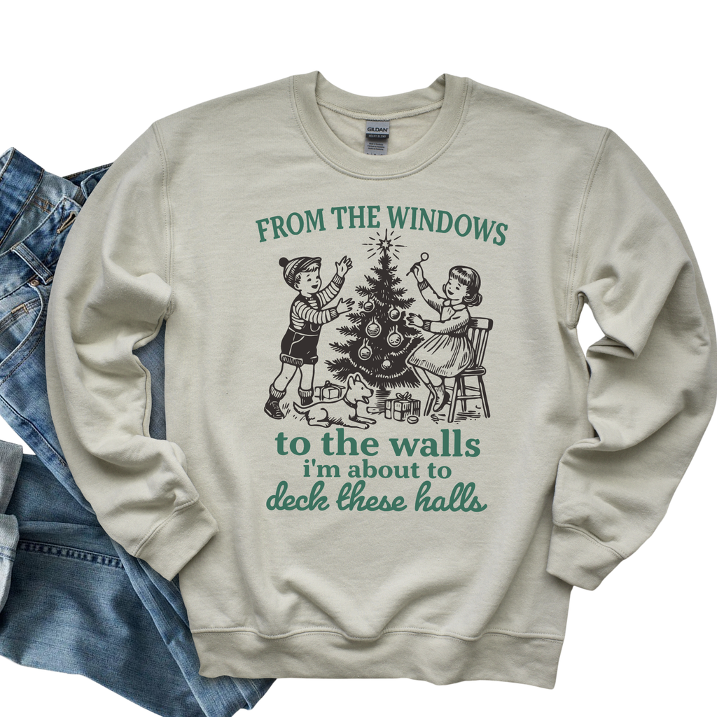 Bring the laughs and the holiday cheer with this From the Windows to the Walls Christmas sweatshirt! This cozy crewneck blends classic retro Christmas vibes with a playful twist that’s sure to make everyone smile. Featuring a vintage-style illustration of kids decorating a tree and the cheeky phrase “From the window to the walls, I’m about to deck these halls,” it’s perfect for holiday parties, gift exchanges, or decorating the house in style.