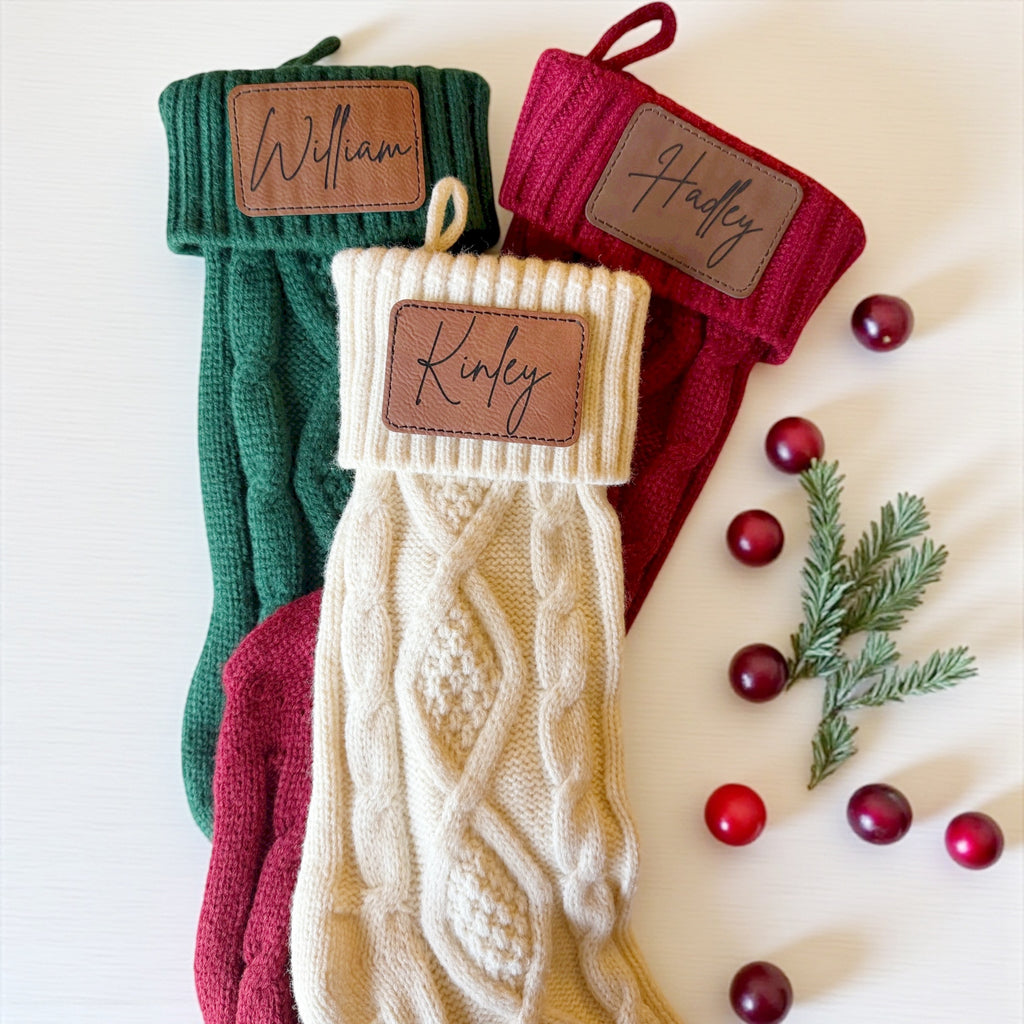 These beautifully knitted stockings are made to be filled with memories, year after year. Each one features a soft knit design and a personalized vegan leather patch, engraved with the name of your choice—turning a classic Christmas stocking into a keepsake your family will treasure.