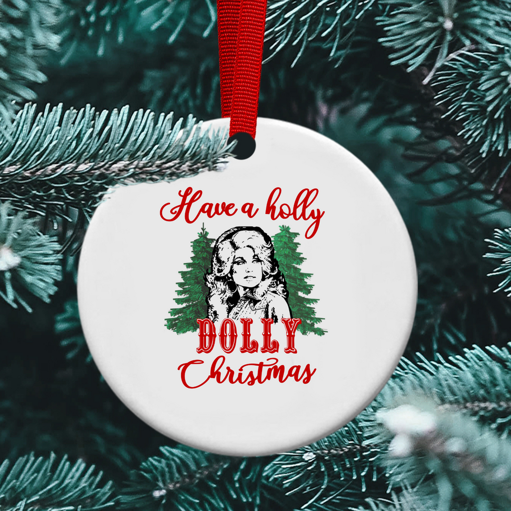 Who doesn't love Dolly! This beautiful ceramic ornament is 2.75" wide and made using a sublimation process with the ink is permanently printed into the ornament- this is not vinyl! The back of the ornament is up to you- make it the same design front and back, or add the year!